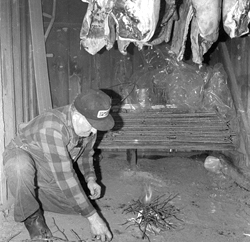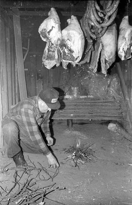 Although fewer hogs today are butchered and cured on the farm as in earlier years, farmers still choose to butcher their own hogs, smoke their own pork, and make their own sausage and scrapple, a variant of hogshead cheese (Figure 12). Even in homes which do not butcher their own hogs, such traditional meats as cracklins and chitlins, available at local processors and grocers, are prepared.