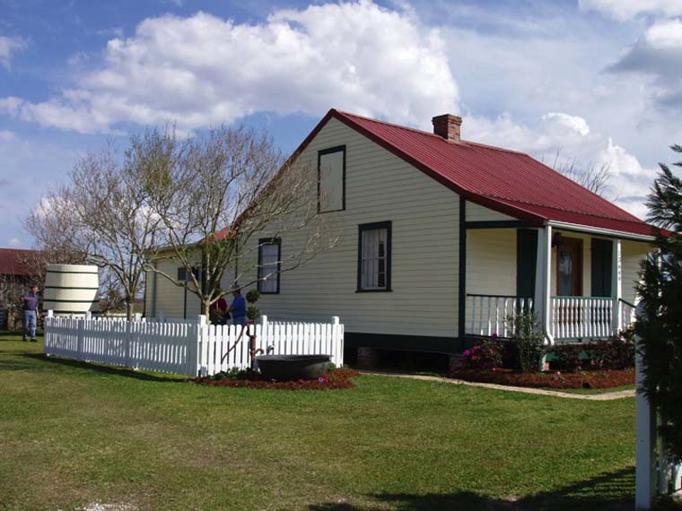 Cypress cisterns for accumulating rain water, outdoor bake ovens, several small frame outbuildings, paling fences enclosing houses and the inevitable china-ball trees, and post-and-rail (pieux) fences setting off fields and lanes, all are part of the type small-farm assemblage. The shotgun house of French Louisiana also stands in curving rows along bayou bank or road. The cypress cistern is present, but the outbuildings and other appurtenances of an agricultural economy are largely missing. (1963, 269)